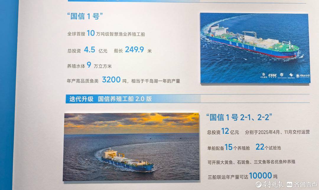正在青岛海洋集团展厅,大型养殖工船的模子惹人瞩目。展厅员刘懿引见,国信1号养殖工船是全球首艘10万吨级聪慧渔业养殖工船,年产高质量鱼类3200吨,相当于千岛湖一全年的产量。